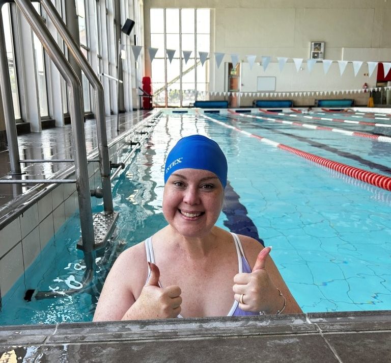 It’s been a long journey relearning how to walk, write, and live independently again, supported by her devoted husband, Jason. Despite these setbacks, Kathryn found renewed purpose through open water swimming. Inspired by Jason, she hoped to take part in the Ocean’s 8 Charity Swim this year, but ongoing health challenges prevent this.